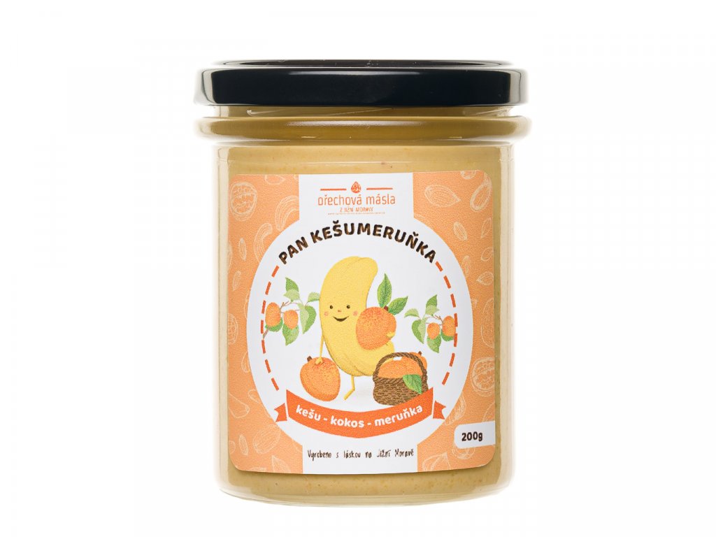 SLOŽENÍ: pražené kešu (Indie, Vietnam) 63%, bio panenský kokosový olej (Filipíny) 25%, lyofilizované meruňky (Srbsko) 6%, javorový cukr (Kanada) 4%, citronová šťáva 2%